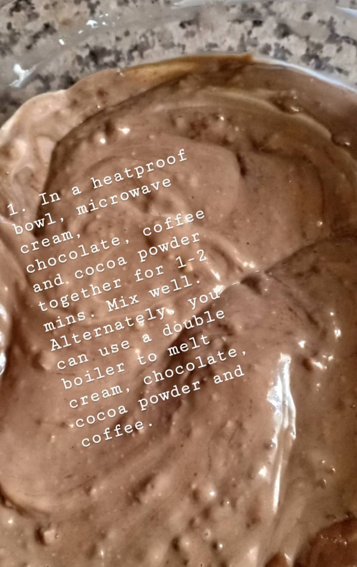 1. In a heatproof bowl, microwave cream, chocolate, coffee and cocoa powder together for 1-2 mins. Mix well.🥣 Alternately, you can use a double boiler to melt cream, chocolate and coffee.