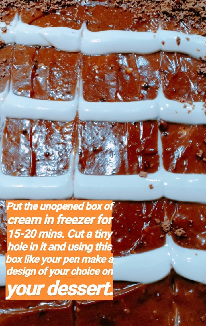 E. Whip 1/2 cup for 3-4 minutes till soft peaks are formed. OR put the unopened box of cream in freezer for 15-20 mins. Cut a tiny hole in it and using this box like your pen make a design of your choice on your dessert.