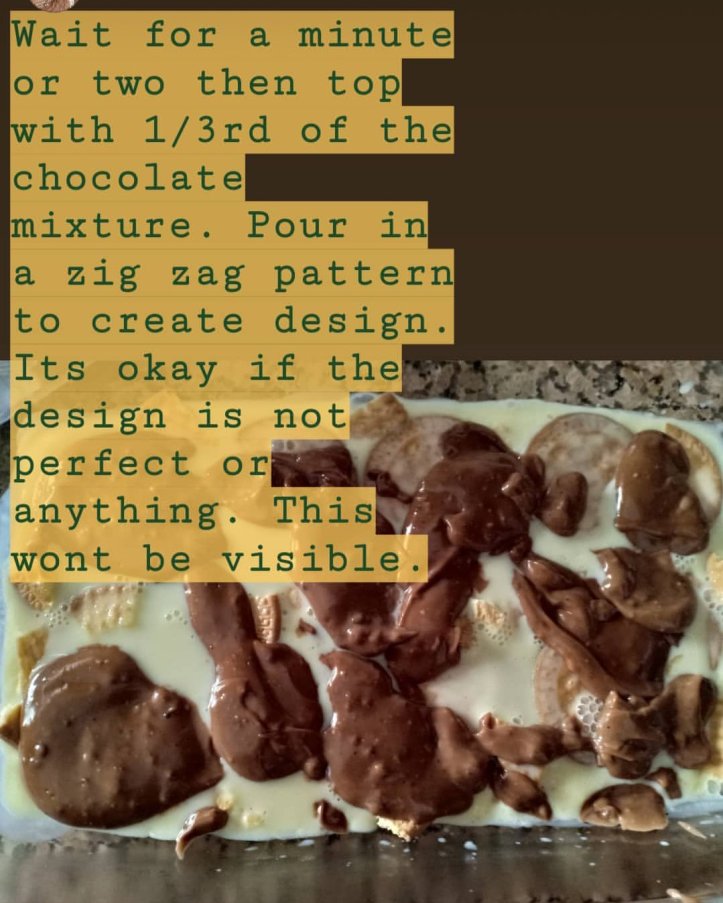 B. Wait for a minute or two then top with 1/3rd of the chocolate mixture. Pour in a zig zag pattern to create design. Its okay if the design is not perfect or anything. This wont be visible.
