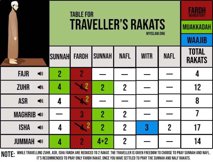 *Do understand the concept of Taqseer Namaz (shortening of Farz namaz) during traveling. During travel, only Salah with 4 Rakat Farz is to be shortened, i.e. Dhuhr, Asr & Isha. Travelers should offer 2 Rakat instead of 4 Rakat of the mentioned Salahs.